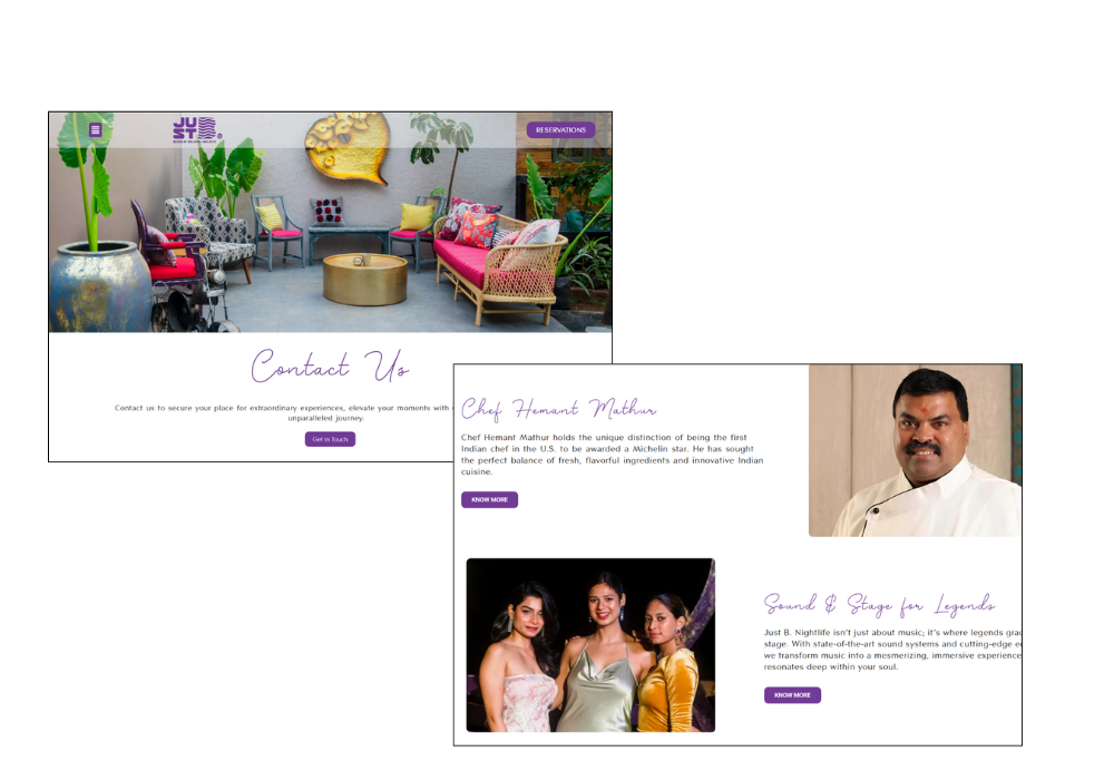 For Just B Goa, we created a website that visually represents the mood, energy, and elegance of the place through a clean, contemporary, and visually immersive website. The objective was to develop an online presence that communicates the spirit of the location to the visitors at first glance, even before their arrival. Our emphasis was on compelling images, easy navigation, quick loading, and a responsive design compatible with all devices. We made sure that each section was designed to facilitate a delightful user journey and to encourage intuitive and exciting exploration. The outcome is a sophisticated, impactful, rich website that is not only aesthetically pleasing but also effectively converts visitor interest into actual visits to the location.